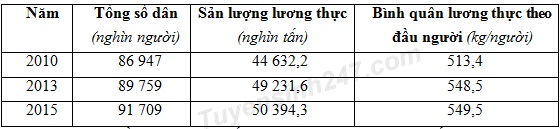 Căn cứ vào bảng số liệu trên, nhận xét nào sau đây đúng về tổng số dân, sản lượng lương thực và bình quân lương thực theo đầu người của nước ta giai đoạn 2010 – 2015?