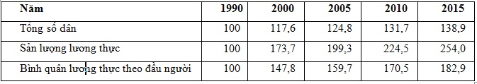 Căn cứ vào bảng số liệu và yêu cầu đề bài => Biểu đồ đường là biểu đồ thích hợp nhất thể hiện tốc độ tăng trưởng tổng số dân, sản lượng lương thực và bình quân lương thực theo đầu người cuả nước ta qua qiai đoạn 1990 – 2015.