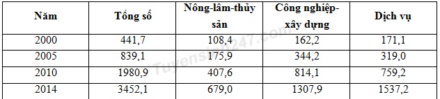 => Biểu đồ thích hợp nhất thể hiện cơ cấu tổng sản phẩm trong nước (GDP) theo giá thực tế phân theo khu vực kinh tế, giai đoạn 2000 – 2014 là biểu đồ miền