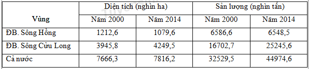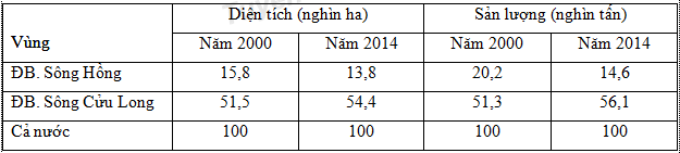 Căn cứ vào kết quả xử lí số liệu từ bảng trên, trong giai đoạn 2000-2014, tỉ trọng về diện tích lúa cả năm của 2 vùng đồng bằng Sông Hồng và đồng bằng Sông Cửu Long so với cả nước thay đổi theo xu hướng