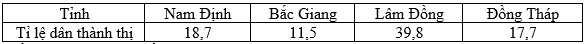 Theo bảng số liệu, nhận xét nào sau đây đúng khi so sánh tỉ lệ dân thành thị trong dân số của các tỉnh năm 2018?