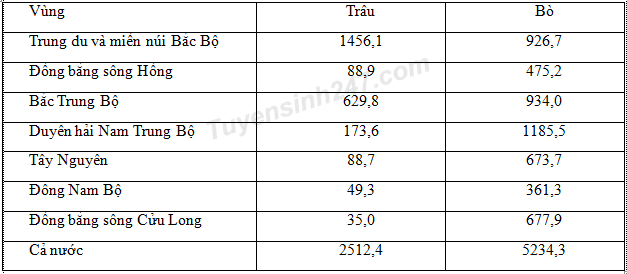 Từ số liệu ở bảng trên, nhận xét nào sau đây không đúng về hiện trạng phân bố đàn trâu, bò ở nước ta năm 2014?