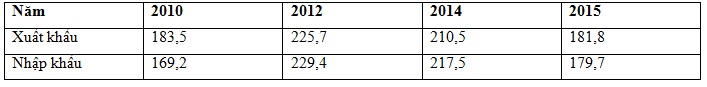 - Giá trị xuất siêu năm 2010 lớn hơn năm 2015 (+14,3 > +2,1) => C đúng.