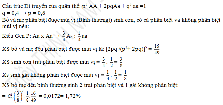 Cho biết ở người gen A quy định tính trạng phân biệt được mùi vị. Alen a quy định không phân biệt được mùi vị nằm trên NST thường. Nếu trong 1 cộng đồng tần số alen a = 0,4 thì xác suất của một cặp vợ chồng đều có kiểu hình phân biệt được mùi vị có thể sinh ra 3 con trong đó 2 con trai phân biệt được mùi vị và 1 con gái không phân biệt được mùi vị là?