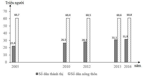 - Biểu đồ cột ghép, giá trị tuyệt đối => thể hiện quy mô dân số thành thị và nông thôn nước ta giai đoạn 2005 - 2016