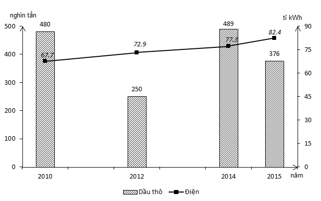 Cho biểu đồ về dầu thô và điện của Phi-lip-pin, giai đoạn 2010 - 2015: