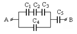 Cho bộ tụ được mắc như hình vẽ. Trong đó: C1 = C2 = C3 = 6 mF; C4 = 2 mF; C5 = 4 mF; q4 = 12.10-6 C.