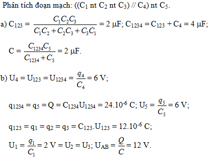 b) Tính điện tích, hiệu điện thế trên từng tụ và hiệu điện thế giữa hai đầu đoạn mạch.