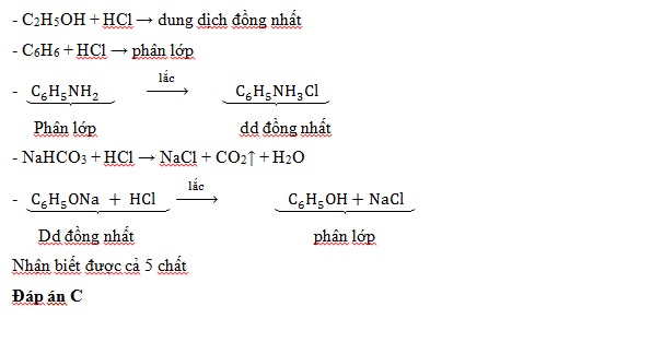 Cho các chất lỏng sau: C2H5OH; C6H6; C6H5NH2; NaHCO3; C6H5ONa. Chỉ dùng dung dịch HCl có thể nhận biết được bao nhiêu chất?