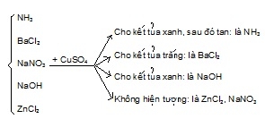 Sau đó dùng NH3 nhận biết ở trên cho vào 2 dung dịch còn lại thì ZnCl2 tạo kết tủa sau đó tạo phức tan. NaNO3 không hiện tượng => Chọn B.