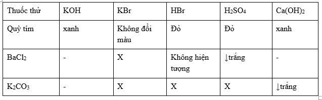 Cho các dung dịch sau: KOH, KBr, HBr, H2SO4, Ca(OH)2.Thuốc thử dùng để phân biệt các dung dịch trên là:
