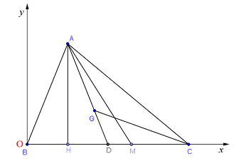 Gắn hệ trục Oxy (như hình vẽ), với \(B\left( {0;0} \right),C\left( {4;0} \right),\,D\left( {2;0} \right),H\left( {1;0} \right),\,A\left( {1;a} \right)\)\( \Rightarrow G\left( {\dfrac{5}{3};\dfrac{a}{3}} \right)\), \(M\left( {4x;0} \right).\)