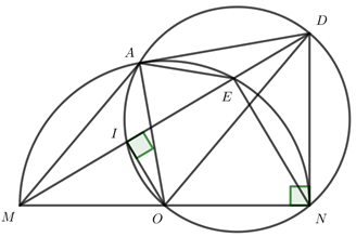 \( \Rightarrow \)\(\Delta OND\) vuông tại N \( \Rightarrow \) \(\Delta OND\) nội tiếp nửa đường tròn đường kính OD (định lý) (2)