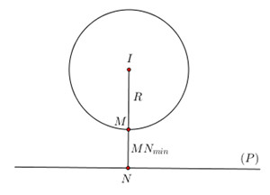 Vậy \(M{N_{\min }} = d\left( {I;\left( P \right)} \right) - R = 4 - 3 = 1\).