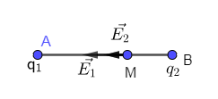 Cường độ điện trường tổng hợp gây ra tại M là \(\overrightarrow E = \overrightarrow {{E_1}} + \overrightarrow {{E_2}} = > \overrightarrow {{E_1}} \uparrow \uparrow \overrightarrow {{E_2}} = > E = {E_1} + {E_2} = {203,4.10^5}\left( {V/m} \right)\)