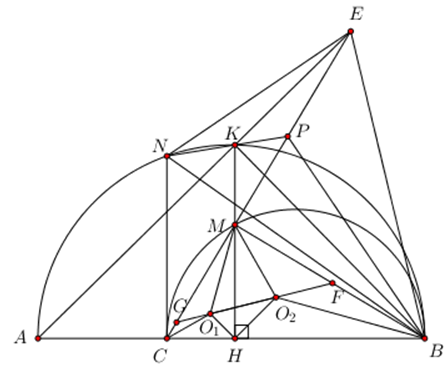 Cho đoạn thẳng AB và C là điểm nằm giữa A và B. Trên cùng một nửa mặt phẳng bờ là đường thẳng AB, vẽ nửa đường tròn đường kính AB và nửa đường tròn đường kính BC. Lấy điểm M thuộc nửa đường tròn đường kính BC (M khác B, C). Kẻ MH vuông góc với BC \(\left( H\in BC \right)\); đường thẳng MH cắt nửa đườn tròn đường kính AB tại K. Hai đường thẳng AK, CM cắt nhau tại E.