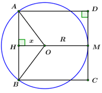 Cho đường tròn \(\left( O \right)\) đi qua hai đỉnh \(A,\,\,B\) và tiếp xúc với cạnh \(CD\) của một hình vuông (tham khảo hình vẽ). Tính bán kính \(R\) của đường tròn đó biết cạnh hình vuông dài \(8cm.\)