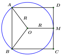 Cho đường tròn \(\left( O \right)\) đi qua hai đỉnh \(A,\,\,B\) và tiếp xúc với cạnh \(CD\) của một hình vuông (tham khảo hình vẽ). Tính bán kính \(R\) của đường tròn đó biết cạnh hình vuông dài \(8cm.\)