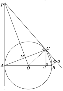 Cho đường tròn \(\left( O \right)\)đường kính \(AB = 5\,cm\). Lấy điểm \(C\) thuộc đường tròn \(\left( O \right)\)sao cho \(AC = 4\,cm\). Gọi \(M\) là trung điểm của đoạn \(AC.\) Tiếp tuyến của đường tròn \(\left( O \right)\)tại \(C\) cắt tia \(OM\) tại \(P.\)