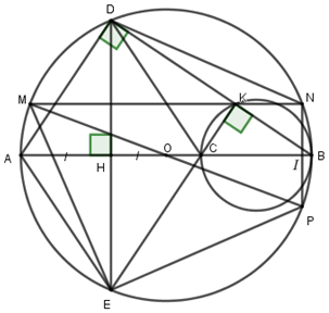 Lại có \(DE \bot AB,NP//DE \Rightarrow NP \bot AB\) \( \Rightarrow I\) là trung điểm của \(NP\) (quan hệ vuông góc giữa đường kính và dây cung) \( \Rightarrow B\) là điểm chính giữa cung \(NP\).