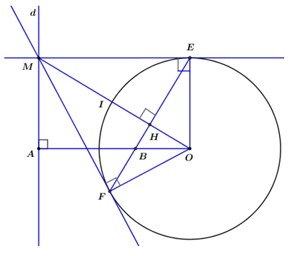 Cho đường tròn \(\left( {O;\;R} \right)\) và điểm \(A\) cố định ở ngoài đường tròn. Vẽ đường tròn đường thẳng \(d\) vuông góc với \(OA\) tại \(A.\) Trên \(d\) lấy điểm \(M.\) Qua \(M\) kẻ hai tiếp tuyến \(ME,\;\;MF\) tới đường tròn \(\left( {O;\;R} \right)\) tiếp điểm lần lượt là \(E\) và \(F.\) Nối \(EF\) cắt \(OM\) tại \(H,\) cắt \(OA\) tại \(B.\)