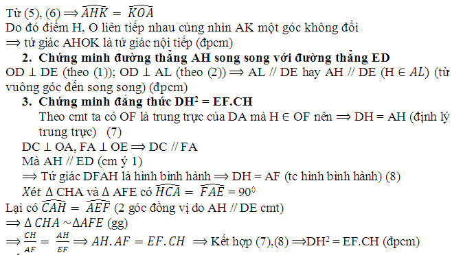 Cho đường tròn tâm O bán kính OA. Điểm C thuộc đoạn thẳng AO (C khác A và O). Đường thẳng vuông góc với AO tại C cắt đường tròn (O) tại hai điểm D và K. Tiếp tuyến tại D của đường tròn (O) cắt đường thẳng AO tại E. Tiếp tuyến tại A của đường tròn (O) cắt đường thẳng DE tại F. Gọi H là giao điểm của hai đường thẳng FO và DK.