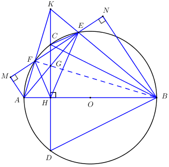 Xét tam giác \(KAB\) có hai đường cao \(AE\) và \(KH\) cắt nhau tại \(G \Rightarrow G\) là trực tâm của tam giác \(KAB\).
