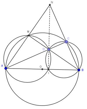 Vì tứ giác AMDI nội tiếp nên \(\widehat{NAB}+\widehat{MDI}={{180}^{0}}\Rightarrow \widehat{NDM}+\widehat{MDI}={{180}^{0}}\Rightarrow \widehat{NDI}={{180}^{0}}\)