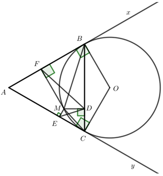 Cho góc \(\angle xAy = {60^o}\) và \(\left( O \right)\) là đường tròn tiếp xúc với tia Ax tại B và tiếp xúc với tia Ay tại C. Trên cung nhỏ \(BC\) của đường tròn \(\left( O \right)\) lấy điểm M và gọi D, E, F lần lượt là hình chiếu vuông góc của M trên BC, CA, AB.