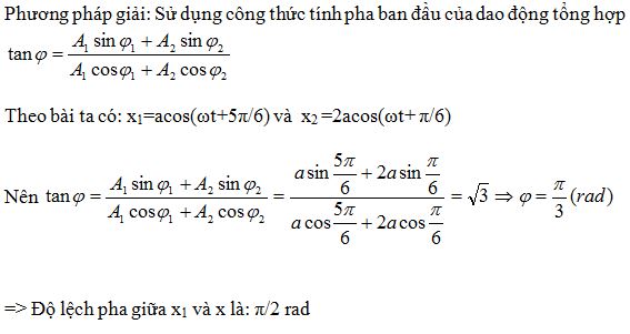 Cho hai dao động điều hòa x1=acos(ωt+5π/6) và x2 =2acos(ωt+ π/6). Độ lệch pha của dao động tổng hợp so với dao động x1 là