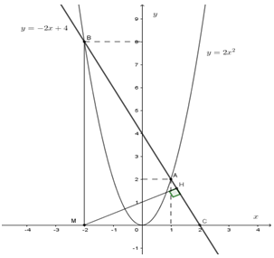 b) Tìm tọa độ hai giao điểm A và B của hai đồ thị đó. Tính khoảng cách từ điểm \(M\left( { - 2;0} \right)\) đến đường thẳng \(AB\).