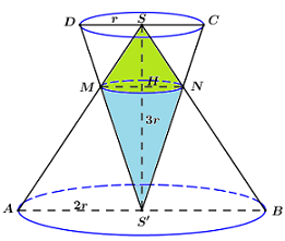 Cho hai khối nón có chung trục \(SS' = 3r\). Khối nón thứ nhất có đỉnh S, đáy là hình tròn tâm S’ bán kính \(2r\). Khối nón thứ hai có đỉnh S’, đáy là hình tròn tâm S bán kính \(r\). Thể tích phần chung của hai khối nón đã cho bằng: