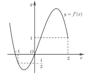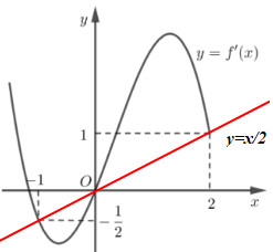 Dựa vào đồ thị hàm số ta thấy phương trình \(f'\left( x \right) = \frac{x}{2} \Leftrightarrow \left[ \begin{array}{l}x = - 1\\x = 0\\x = 2\end{array} \right.\) .