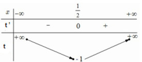 Xét \(t = 4{x^2} - 4x \Rightarrow t' = 8x - 4\) có bảng biến thiên :