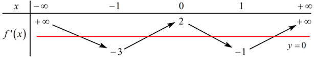 Dựa vào bảng biến thiên ta thấy: \(f' = 0 \Leftrightarrow \left[ \begin{array}{l}x = {x_1} \in \left( { - \infty ; - 1} \right)\\x = {x_2} \in \left( { - 1;\,\,0} \right)\\x = {x_3} \in \left( {0;\,\,1} \right)\\x = {x_4} \in \left( {1; + \infty } \right)\end{array} \right..\)