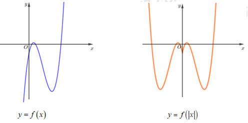 - Bỏ đi phần đồ thị bên trái trục \(Oy\) rồi lấy đối xứng phần đồ thị bên phải qua trục \(Oy\) của đồ thị hàm số \(y = f\left( x \right)\) ta được đồ thị hàm số \(y = f\left( {\left| x \right|} \right)\)