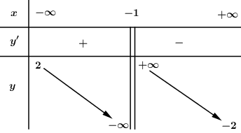 Dựa vào BBT ta có: \(\mathop {\lim }\limits_{x \to - \infty } y = 2\), \(\mathop {\lim }\limits_{x \to + \infty } y = - 2\), \(\mathop {\lim }\limits_{x \to - {1^ - }} y = - \infty \), \(\mathop {\lim }\limits_{x \to - {1^ + }} y = + \infty \).