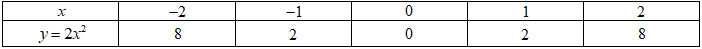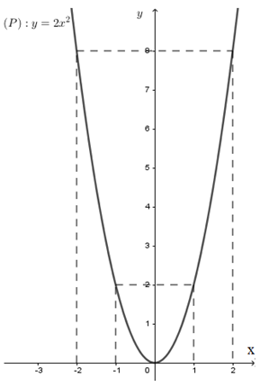 Đồ thị hàm số \(y = 2{x^2}\) là parabol \(\left( P \right)\) đi qua các điểm \(\left( { - 2;8} \right),\left( { - 1;2} \right),\left( {0;0} \right),\left( {1;2} \right),\left( {2;8} \right)\)