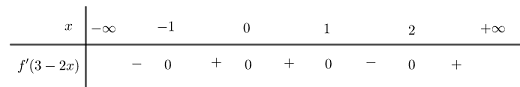 \(\begin{array}{l}g'\left( x \right) = \left( {3 - 2x} \right)'.f'\left( {3 - 2x} \right) = - 2.f'\left( {3 - 2x} \right)\\g'\left( x \right) = 0 \Leftrightarrow f'\left( {3 - 2x} \right) = 0 \Leftrightarrow \left[ \begin{array}{l}3 - 2x = - 1\\3 - 2x = 1\\3 - 2x = 3\\3 - 2x = 5\end{array} \right. \Leftrightarrow \left[ \begin{array}{l}x = 2\\x = 1\\x = 0\\x = - 1\end{array} \right.\end{array}\)