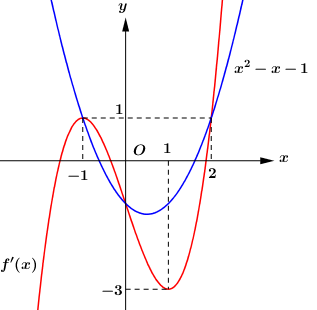 Số nghiệm của phương trình là số giao điểm của đồ thị hàm số \(y = f'\left( x \right)\) và \(y = {x^2} - x - 1\).