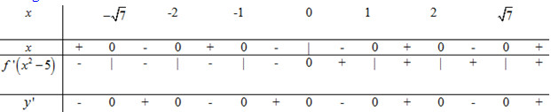 \(f'\left( {{x^2} - 5} \right) = 0 \Leftrightarrow \left[ \begin{array}{l}{x^2} - 5 = - 4\\{x^2} - 5 = - 1\\{x^2} - 5 = 2\end{array} \right. \Leftrightarrow \left[ \begin{array}{l}{x^2} = 1\\{x^2} = 4\\{x^2} = 7\end{array} \right. \Leftrightarrow \left[ \begin{array}{l}x = \pm 1\\x = \pm 2\\x = \pm \sqrt 7 \end{array} \right.\)