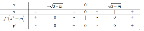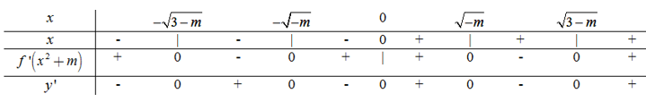 \(y' = 0 \Leftrightarrow \left[ \begin{array}{l}x = 0\\f'\left( {{x^2} + m} \right) = 0\end{array} \right. \Leftrightarrow \left[ \begin{array}{l}x = 0\\{x^2} + m = 0\\{x^2} + m = 3\end{array} \right.\) (do tại \(x = 1\) ta có\(y = f'(x)\) không đổi dấu) \( \Leftrightarrow \left[ \begin{array}{l}x = 0\\{x^2} = - m\\{x^2} = 3 - m\end{array} \right.\)