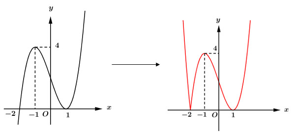 Dựa vào đồ thị hàm số \(y = \left( {x + 2} \right){\left( {x - 1} \right)^2}\) đề bài cho ta suy ra đồ thị hàm số \(y = \left| {\left( {x + 2} \right){{\left( {x - 1} \right)}^2}} \right|\) như sau:
