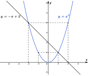 Cho hàm số \(y = {x^2}\) có đồ thị \(\left( P \right)\) và hàm số \(y = - x + 2\) có đồ thị \(\left( d \right)\).