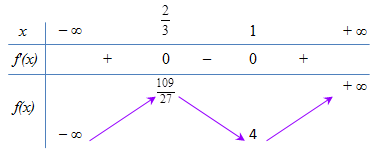 \(f'\left( x \right) = 6{x^2} - 10x + 4 = 0 \Leftrightarrow \left[ \begin{array}{l}x = 1\\x = \dfrac{2}{3}\end{array} \right.\)