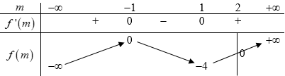 Xét hàm số \(f\left( m \right) = {m^3} - 3m - 2\) ta có \(f'\left( m \right) = 3{m^2} - 3 = 0 \Leftrightarrow m = \pm 1\),