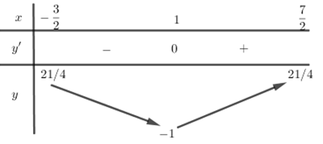 Xét hàm số \(t\left( x \right)={{x}^{2}}-2x\) trên \(\left[ -\frac{3}{2};\frac{7}{2} \right]\) ta có \(t'\left( x \right)=2x-2=0\Leftrightarrow x=1\in \left[ -\frac{3}{2};\frac{7}{2} \right]\)
