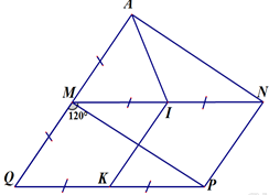Cho hình bình hành \(MNPQ\) có \(MN=2MQ\) và \(\widehat{M}={{120}^{0}}\). Gọi I, K lần lượt là trung điểm của MN, PQ và A là điểm đối xứng của Q qua M.