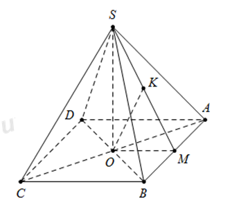 \(\left\{ \begin{array}{l}AB \bot OM\\AB \bot SO\end{array} \right. \Rightarrow AB \bot \left( {SOM} \right) \Rightarrow AB \bot OK\,\,\left( 2 \right)\)