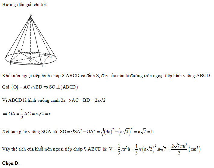 Cho hình chóp đều S.ABCD, đáy có cạnh 2a, cạnh bên bằng 3a. Hình nón (N) ngoại tiếp hình chóp S.ABCD. Thể tích của khối nón (N) là: